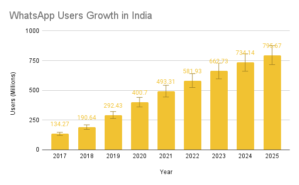 WhatsApp, first introduced in 2009, is now available in 60 languages across 180+ countries. It has over 2 billion users who spend roughly 195 minutes per week on the platform. To use this application, a user requires a basic smartphone.